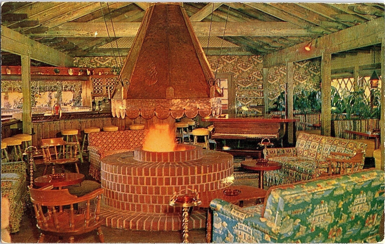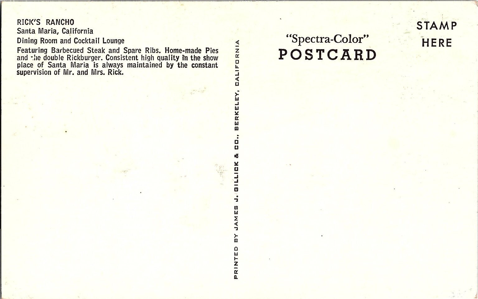 This vibrant vintage postcard features the cozy dining room and cocktail lounge of Rick's Rancho in Santa Maria, California. Printed using the iconic "Spectra-Color" photochrome process by James J. Billick & Co., Berkeley, California, this postcard captures the warm ambiance of a rustic setting complete with patterned tablecloths and a glowing fireplace. The card highlights Rick's Rancho's signature menu items, including barbecued steak, spare ribs, home-made pies, and the famous double Rickburger, showcasing its status as a beloved local eatery.Produced in the mid-20th century using high-quality lithograph printing, this postcard exemplifies the classic Americana charm and regional dining culture of California. The card measures the continental standard size of 6 x 4 inches, perfect for collectors of photochrome postcards or enthusiasts of California's historic landmarks. This licensed reprint postcard connects the viewer to Santa Maria's culinary heritage and mid-century hospitality, making it a unique collectible for postcard and Americana collectors.