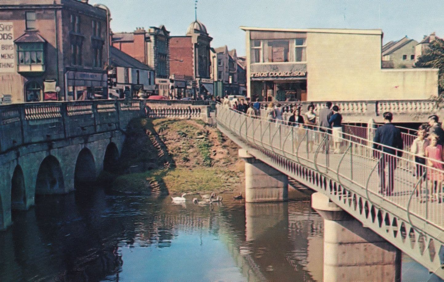 tp38 A rare 1970s postcard of the bridge over the River Avon with a clothes shop opposite and its large wall poster and another store called Thos Cooke which could be the 1970s Thomas Cooke with altered fascia - ha ... Read More