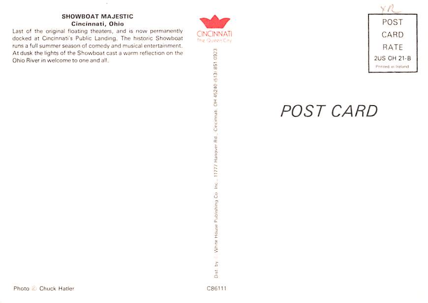River Showboat - Cincinnati, Ohio Grade: 1 Category: Continental Size Postcard, Approx 4 in x 6 in (10 cm x 15.25 cm) Product Size: Continental size: 4X6 inches (10.5 cm x 15 cm) Grading Scale: Grade 1 = Perfe ... Read More