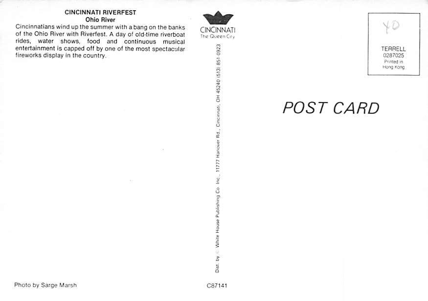 Riverfest , Cincinnati, Ohio Postcard - View Images Grade: 1 Size: C - Continental Size Postcard - approximately 4 inch X 6 inch (15 CM X 10.5 CM) Grading Scale: Grade 1 = Perfect corners Grade 2 = Very Minimal ... Read More