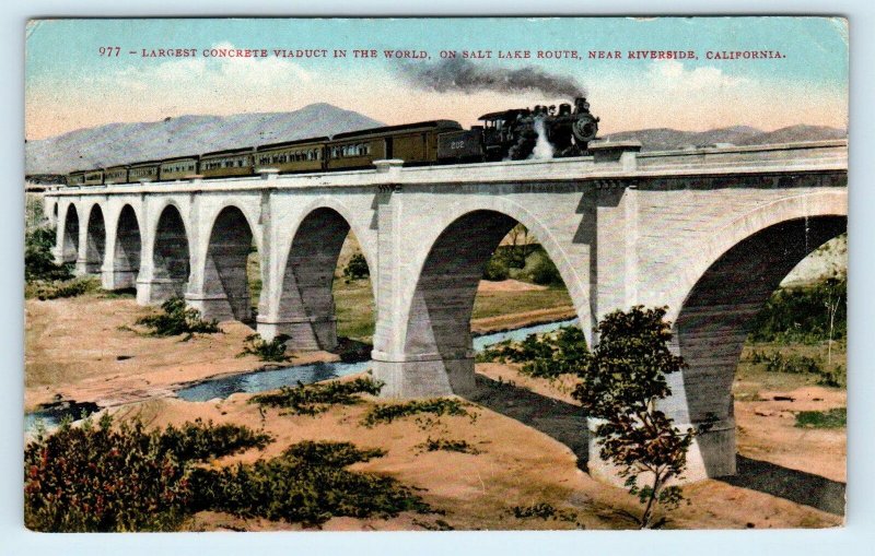 RIVERSIDE, CA ~ RAILROAD TRAIN on Largest CONCRETE VIADUCT 1916 Postcard