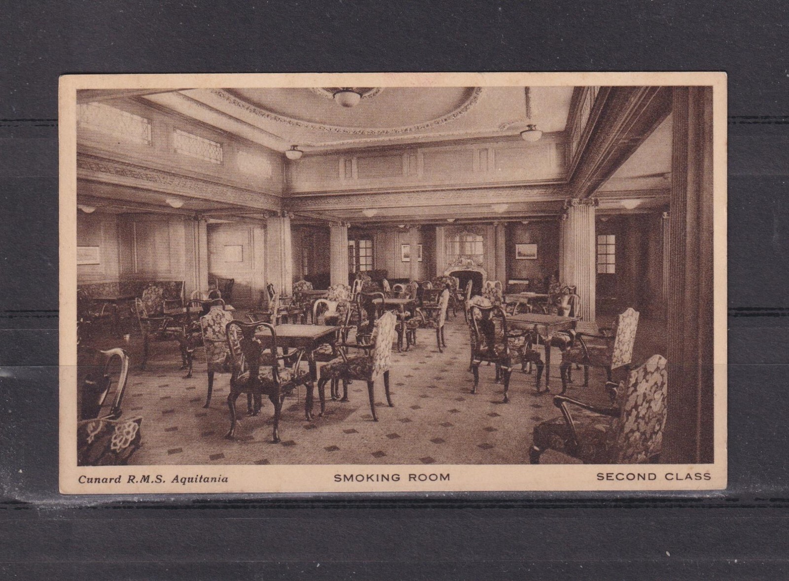 " RMS AQUITANIA '', SMOKING ROOM, SECOND CLASS, CUNARD LINE, c1930 ppc., unused.