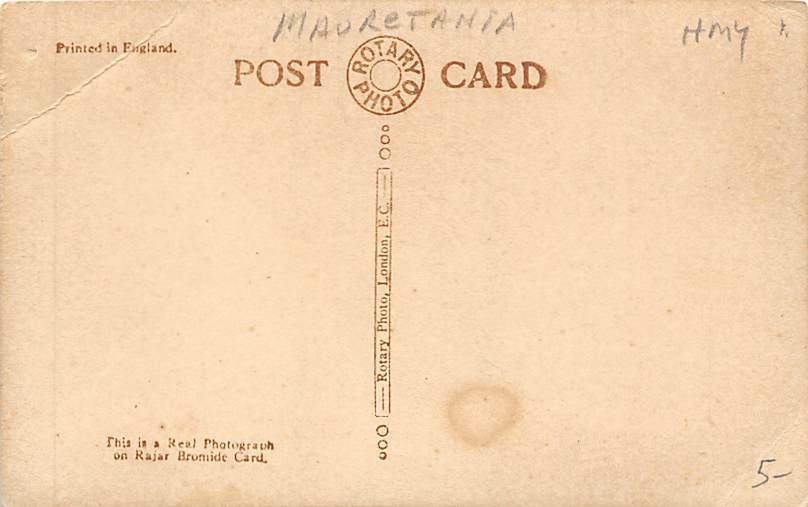 RM.S. Mauretania, Cunard Lines Postcard View image, Grade: 4, , Size: Regular Size Postcard - approximately 3 1/2 inch x 5 1/2 inch (9 CM x 14 CM) Grading Scale: Grade 1 = Perfect corners Grade 2 = Very Minimal ... Read More