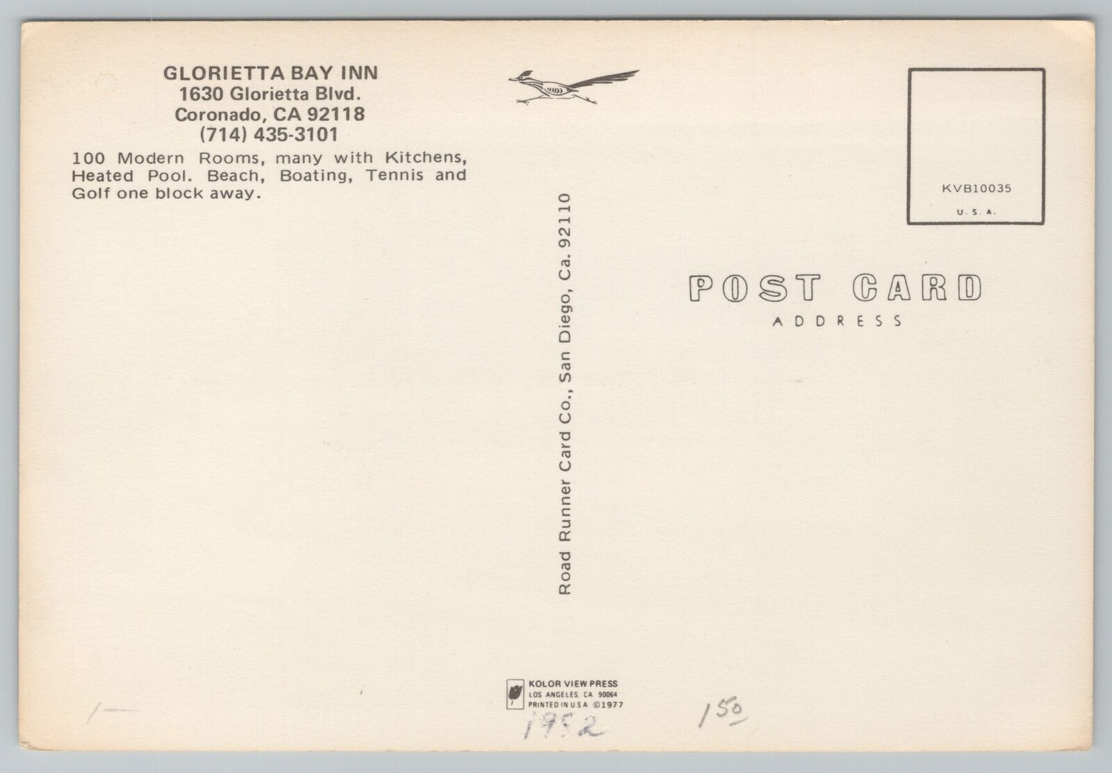 Roadside Motel~Coronado CA~Glorietta Bay Inn~Continental Postcard