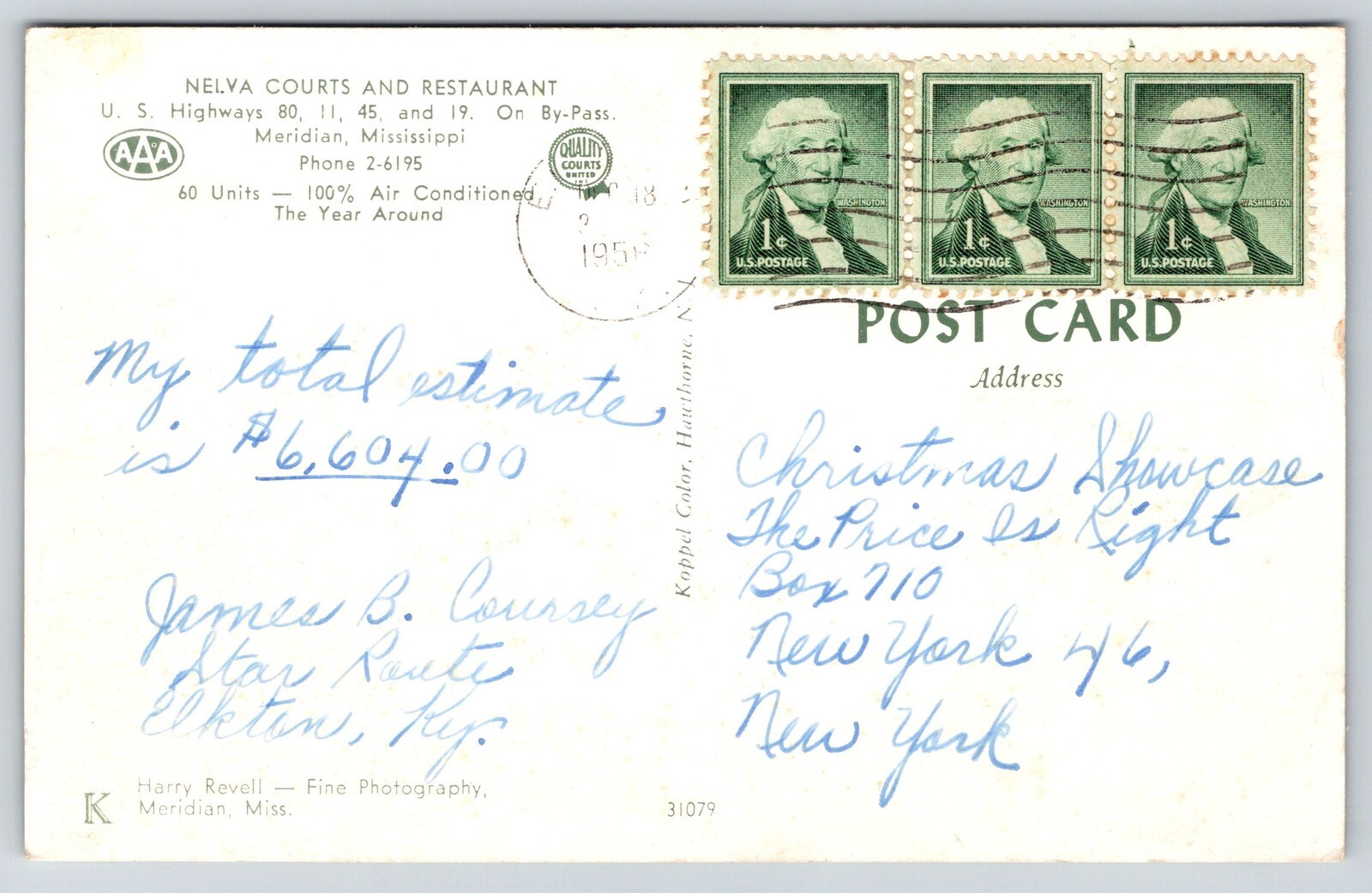 Roadside~Meridian Mississippi~Nelva Courts~Restaurant~Powerlines~Sign~1958 PC