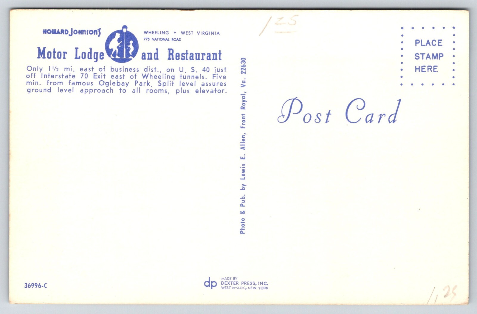 Roadside~Wheeling WV~Howard Johnson Motor Lodge~Restaurant~Sign~1950s Postcard