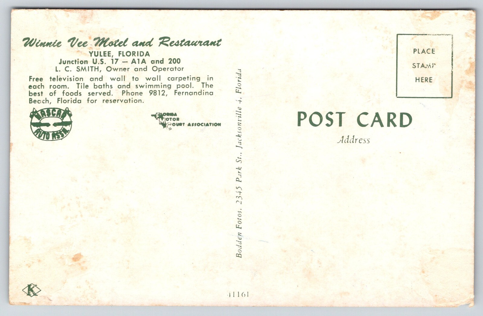 Roadside~Yulee Florida~Winnie Vee Motel~Restaurant~Interior~Pool~Sign~1950s PC