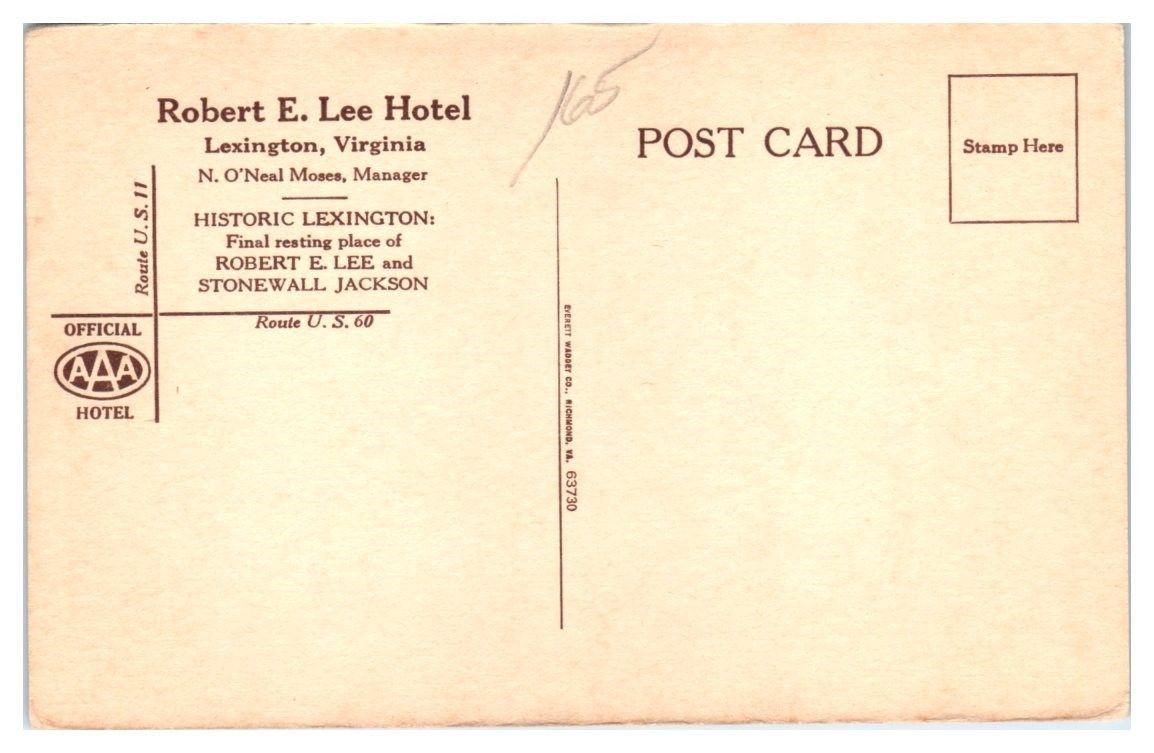 I have for sale one Robert E. Lee Hotel, Lexington, VA Postcard.