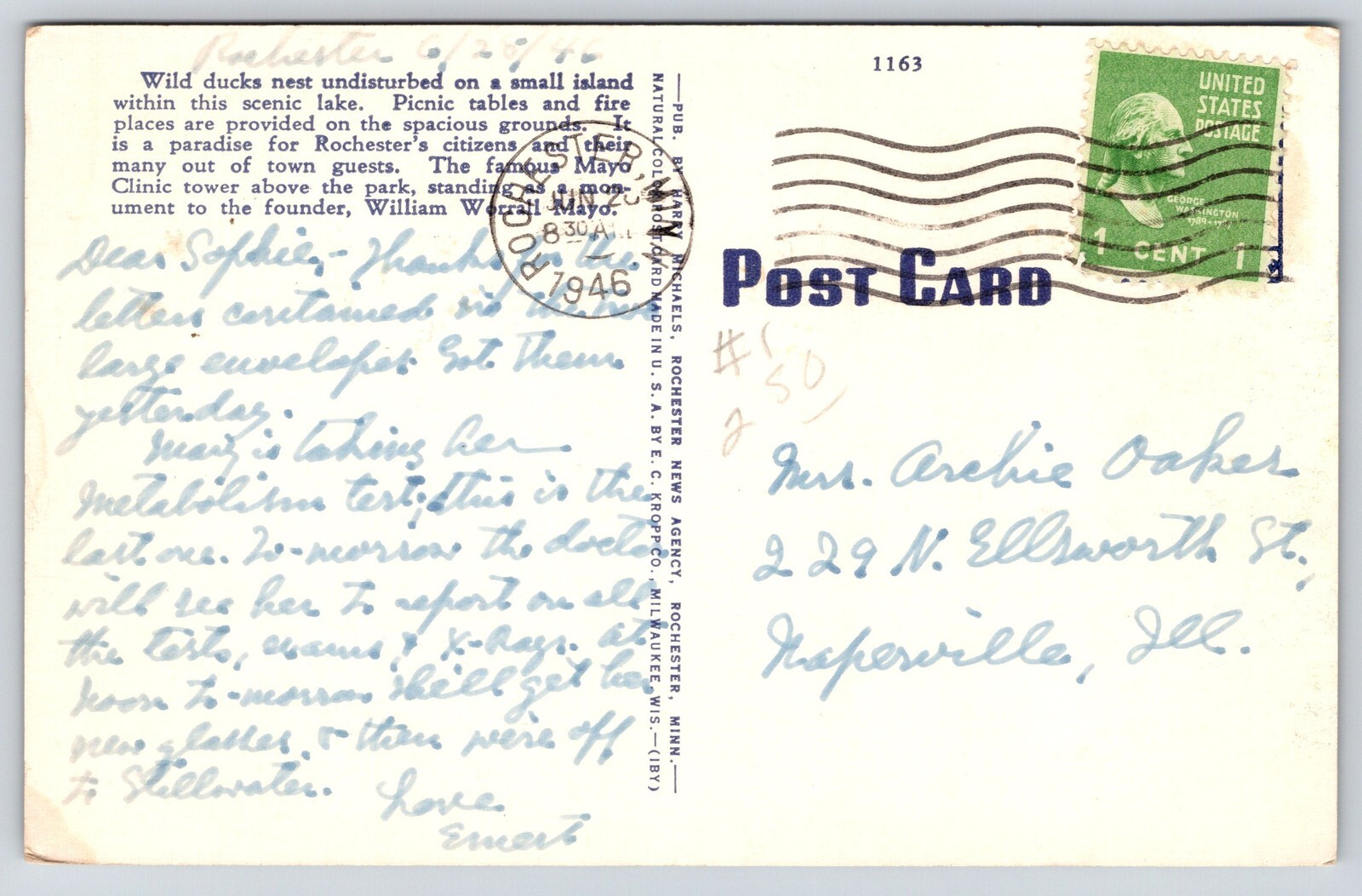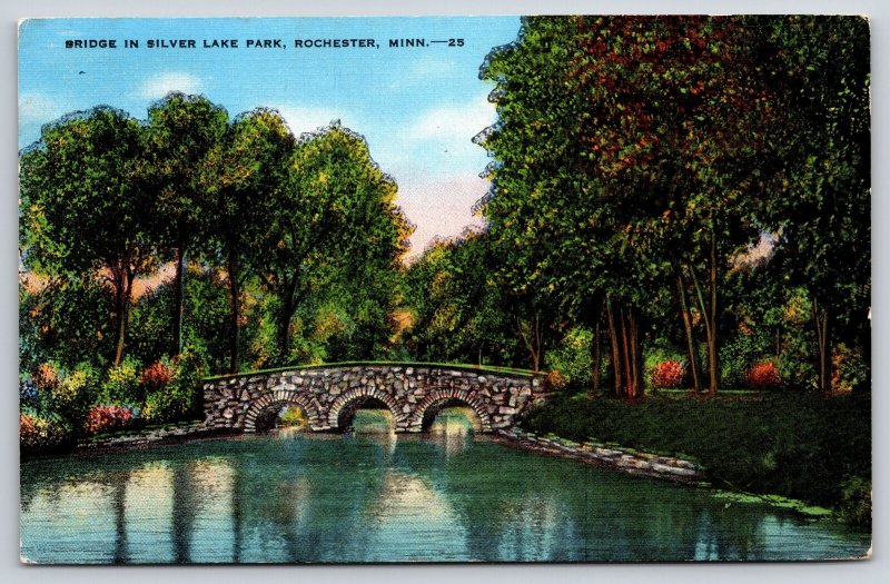 Rochester Minnesota~Silver Lake Park~Stone Bridge~Reflection~Linen 1946 Postcard