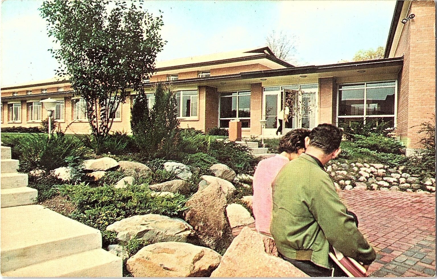 This vintage postcard showcases the Classroom Building at Rockford College in Rockford, Illinois, featuring a unique two-level seminar classroom design. The image highlights the seminar table accommodating 15 students with the professor positioned on the lower level, while built-in desks on the upper level surround the seminar area, allowing the room to be used by 35 students. The lithograph print captures the mid-century architectural and educational style, with lush landscaping and rock arrangements framing the scene.Published by Color-View, Inc. of Rockford, Illinois, and printed by Dexter Press, Inc. of West Nyack, New York, this postcard is a classic example of Photochrome printing popular from 1939 onwards. The depiction of the campus building offers a glimpse into historical collegiate environments and seminar learning spaces. Collectors and enthusiasts of educational history, architecture, and vintage postcards will appreciate this piece from the heart of the Midwest.