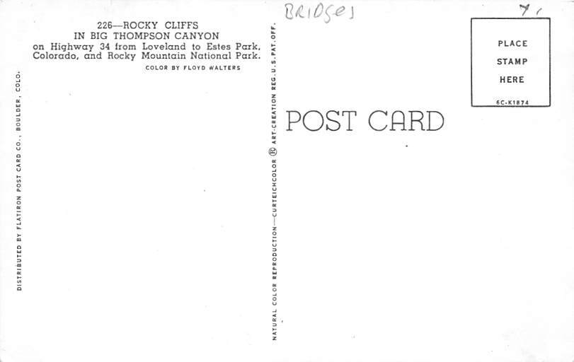 Rocky Cliffs in Big Thompson Canyon Postcard Unused, Grade: 1, , Size: Regular Size Postcard - approximately 3 1/2 inch x 5 1/2 inch (9 CM x 14 CM) Grading Scale: Grade 1 = Perfect corners Grade 2 = Very Minima ... Read More
