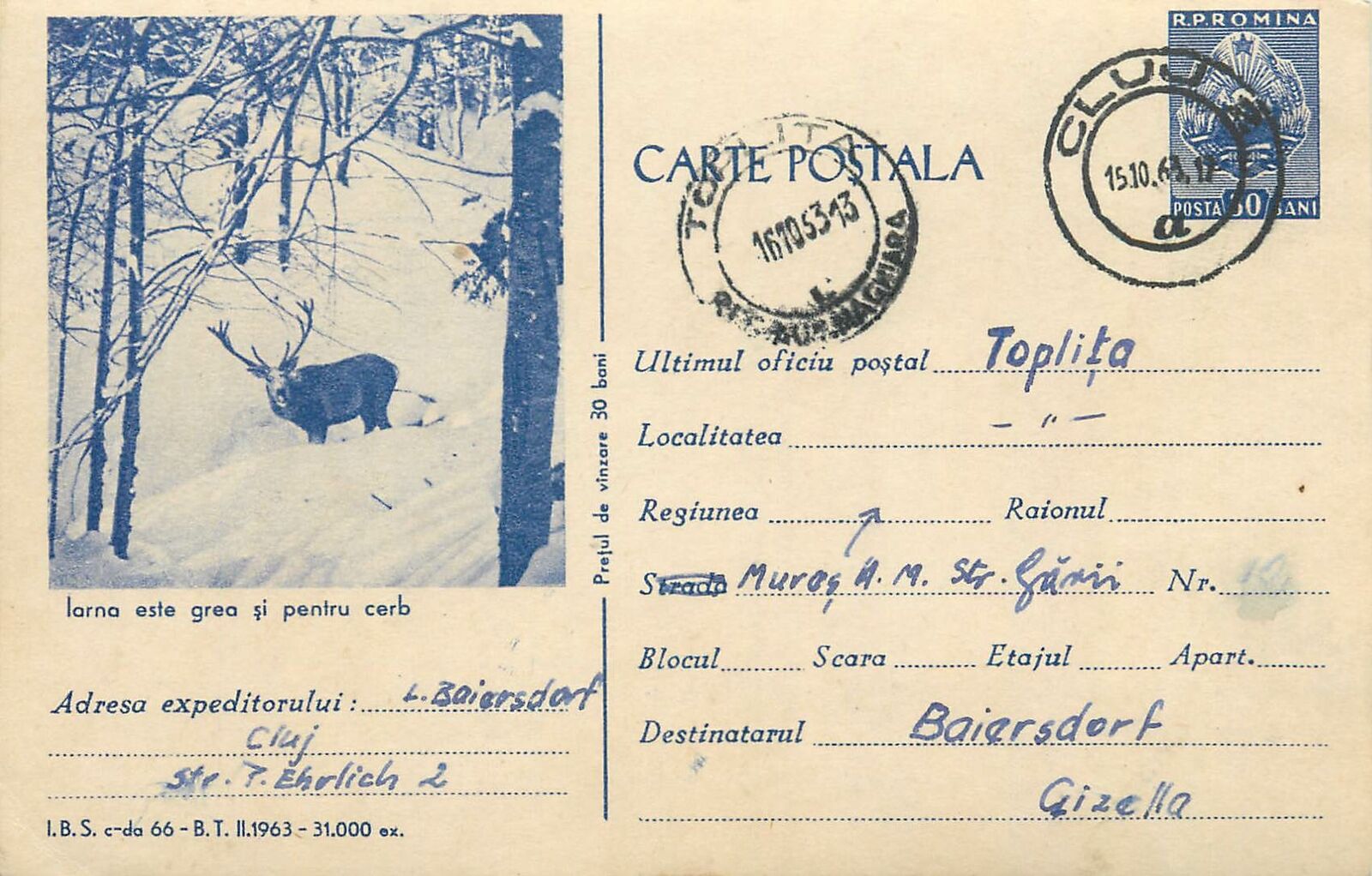 Romania postal stationery postcard stag in winter