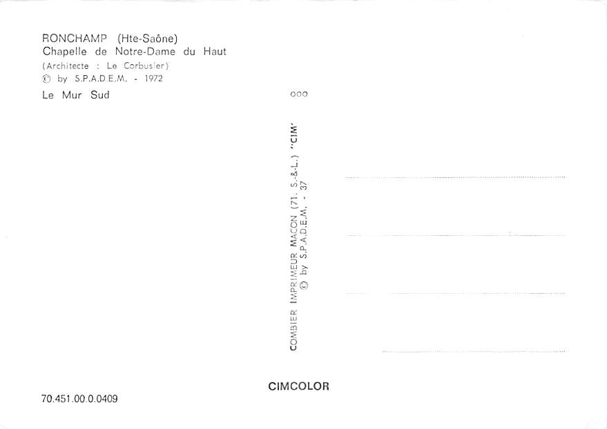 Ronchamp - Notre Dame Grade: 2 Category: Continental Size Postcard, Approx 4 in x 6 in (10 cm x 15.25 cm) Product Size: Continental size: 4X6 inches (10.5 cm x 15 cm) Grading Scale: Grade 1 = Perfect corners Gr ... Read More