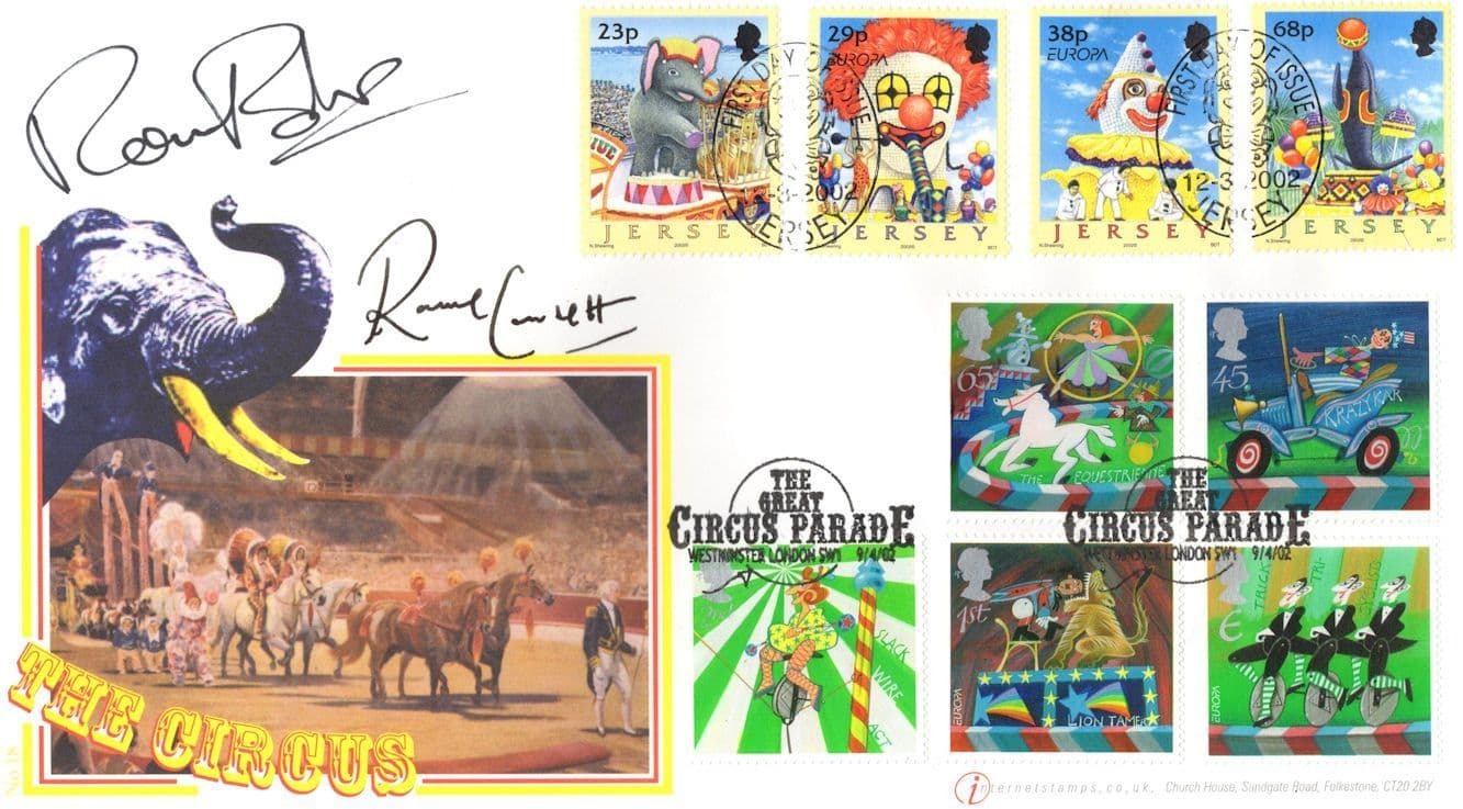 STB015 This is stunning Buckingham collectors official limited Circus Parade first day cover hand signed by both Ronnie Barker and Ronnie Corbett where their signatures rests perfectly accompanying the special hand commemorative franks. which has been officially certified by the publishers with full hallmarking of the series in absolute brand new mint condition. You wont source better.