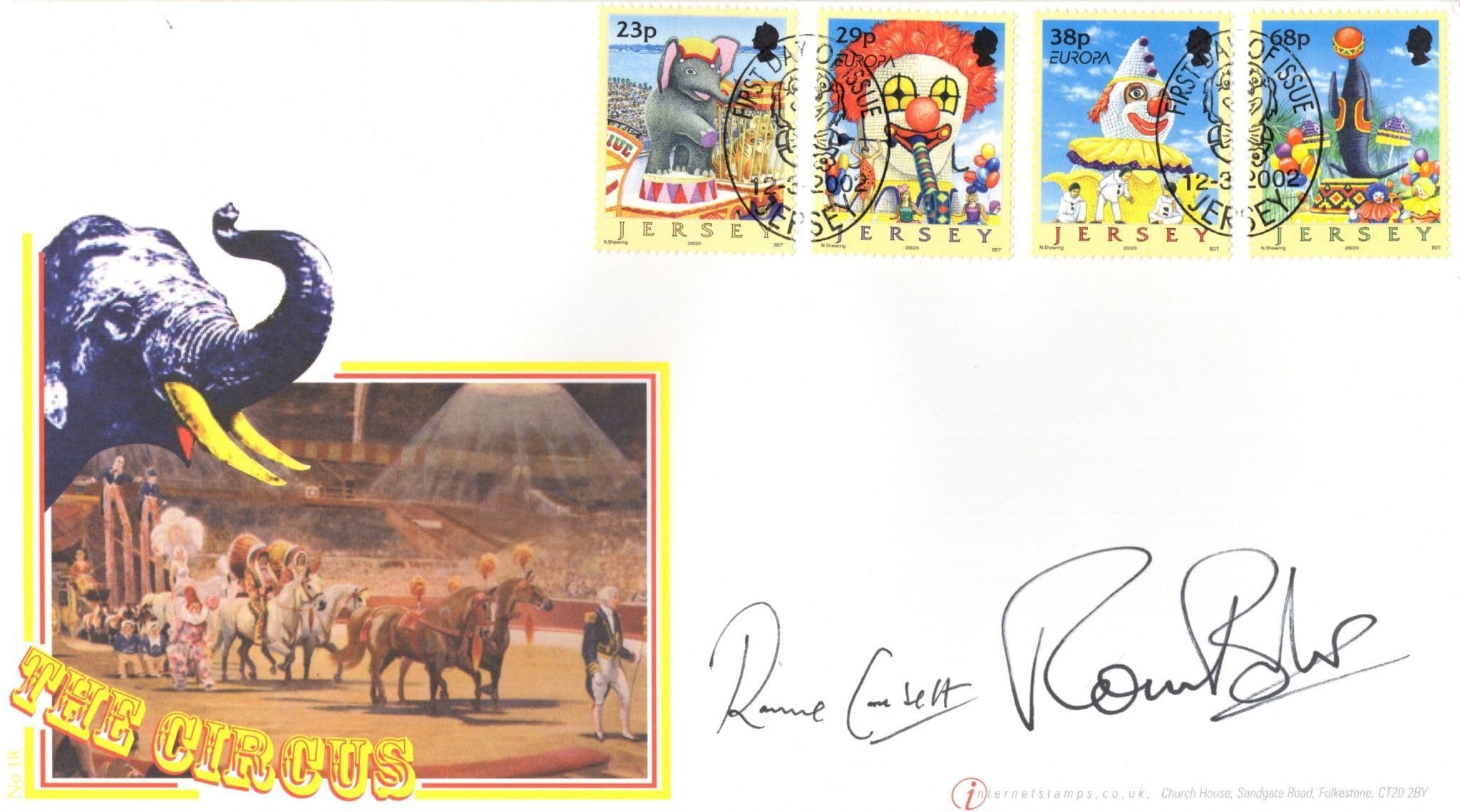 STB015 This is stunning Buckingham collectors official limited Circus Parade first day cover hand signed by both Ronnie Barker and Ronnie Corbett where their signatures rests perfectly accompanying the special hand commemorative franks. which has been officially certified by the publishers with full hallmarking of the series in absolute brand new mint condition. You wont source better.