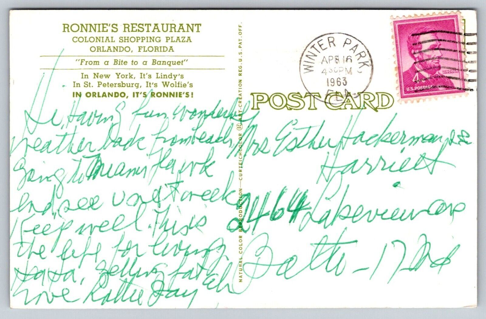 Ronnie's Restaurant Orlando Florida 1963 Postcard