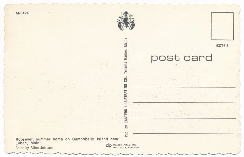Roosevelt Summer Home on Campobello Island. near Lubec, Maine. Standard sized chrome card. Made by Dexter Press of West Nyack NY. Very good condition.