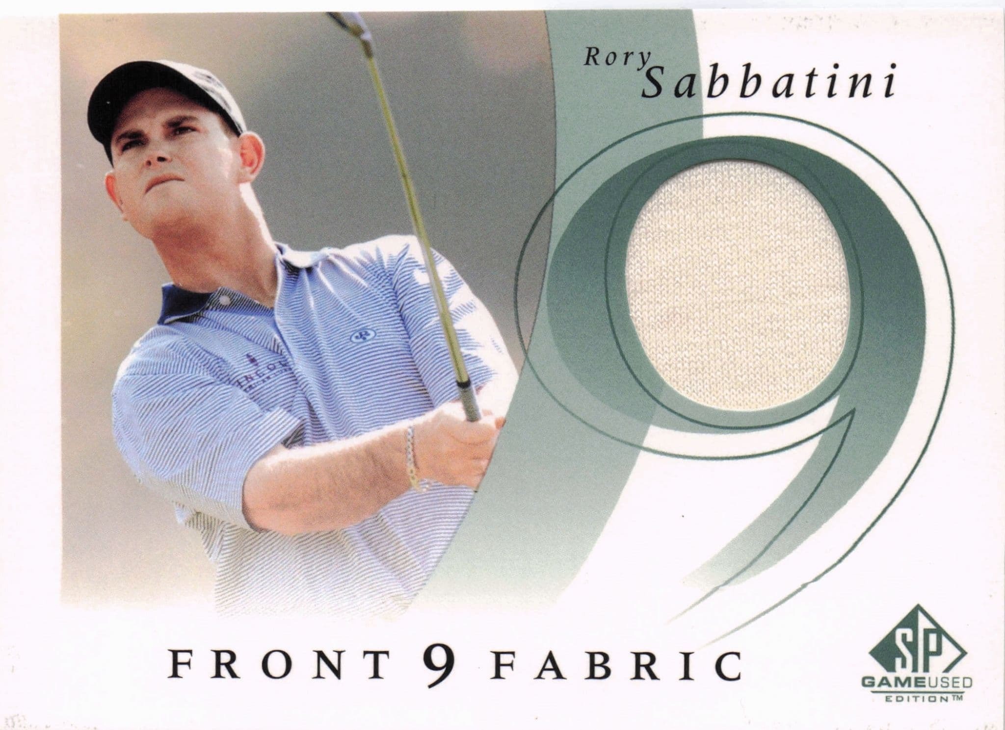 GB0215 Official 3.5" x 2.5" 2002 Upper Deck Front 9 Fabric trading card with swatch housing a piece of a genuine tournament shirt worn by Rory Sabbatini and fully authenticated on reverse in mint condition. (please allow if image movement during scanning). Reverse reads (with further photo and hologram for lifetime COA)