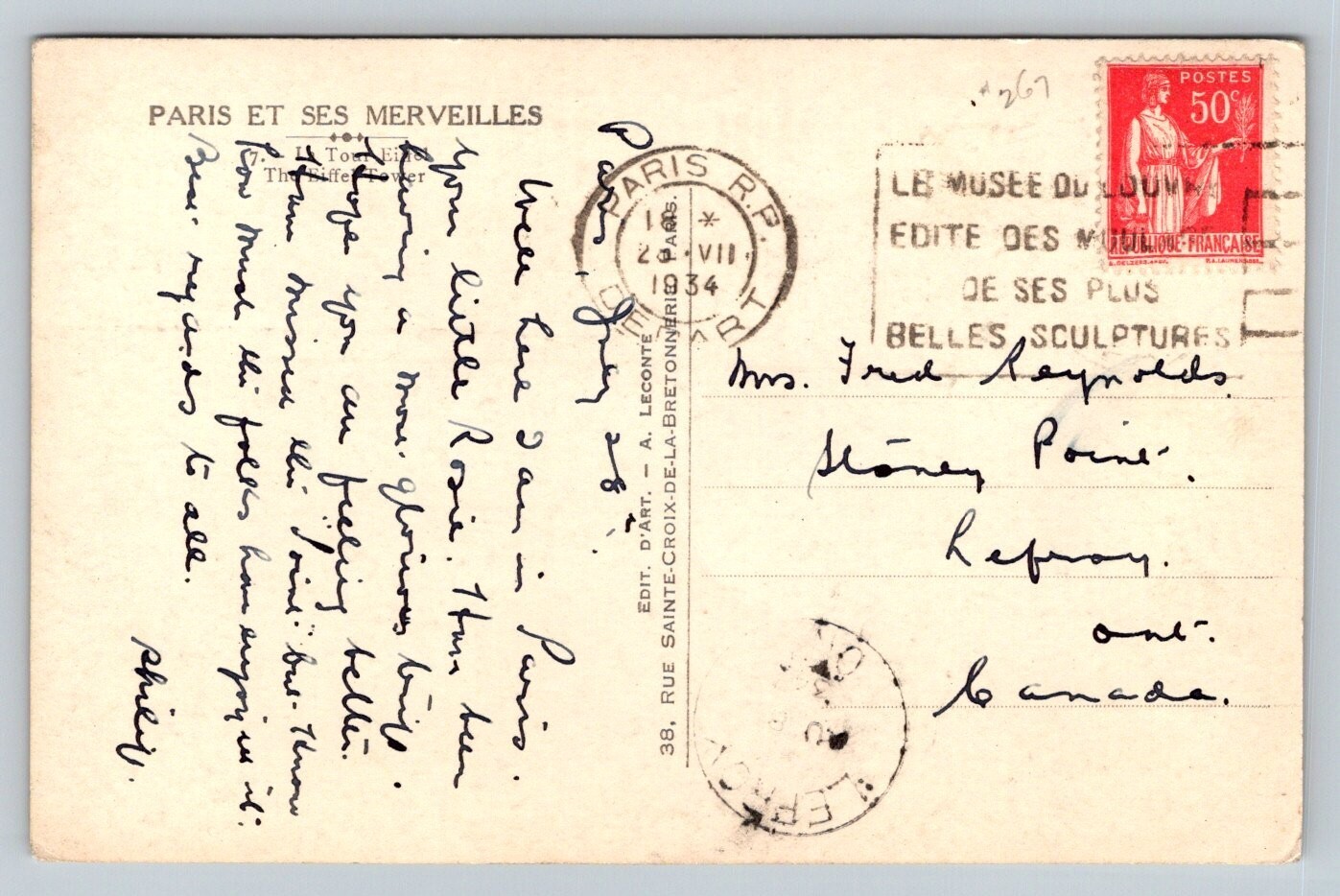 RPPC 1934 Eiffel Tower Paris France Postcard