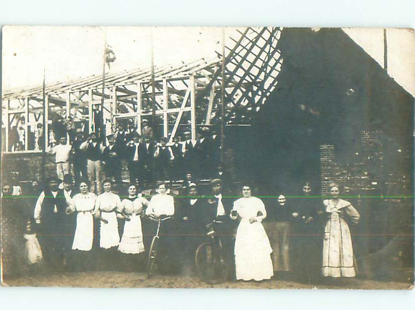 rppc c1910 ANTIQUE BICYCLES IN CROWD AT CONSTRUCTION SITE AC8780