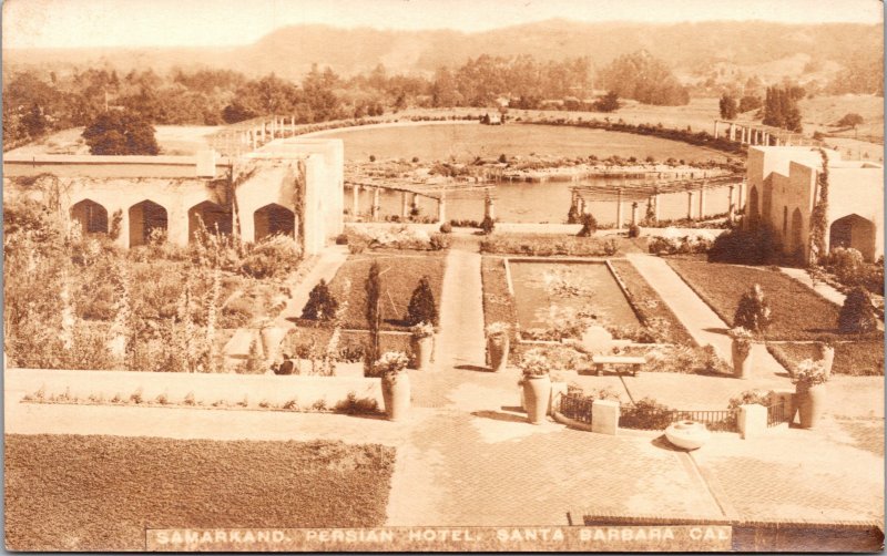 Original real photo postcard of the Samarkand Persian Hotel in Santa Barbara California. The view highlights the formal gardens, walkways, arches, reflecting pond, and landscaped grounds. Unused card with light age wear. A desirable California hotel postc