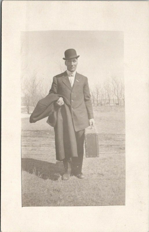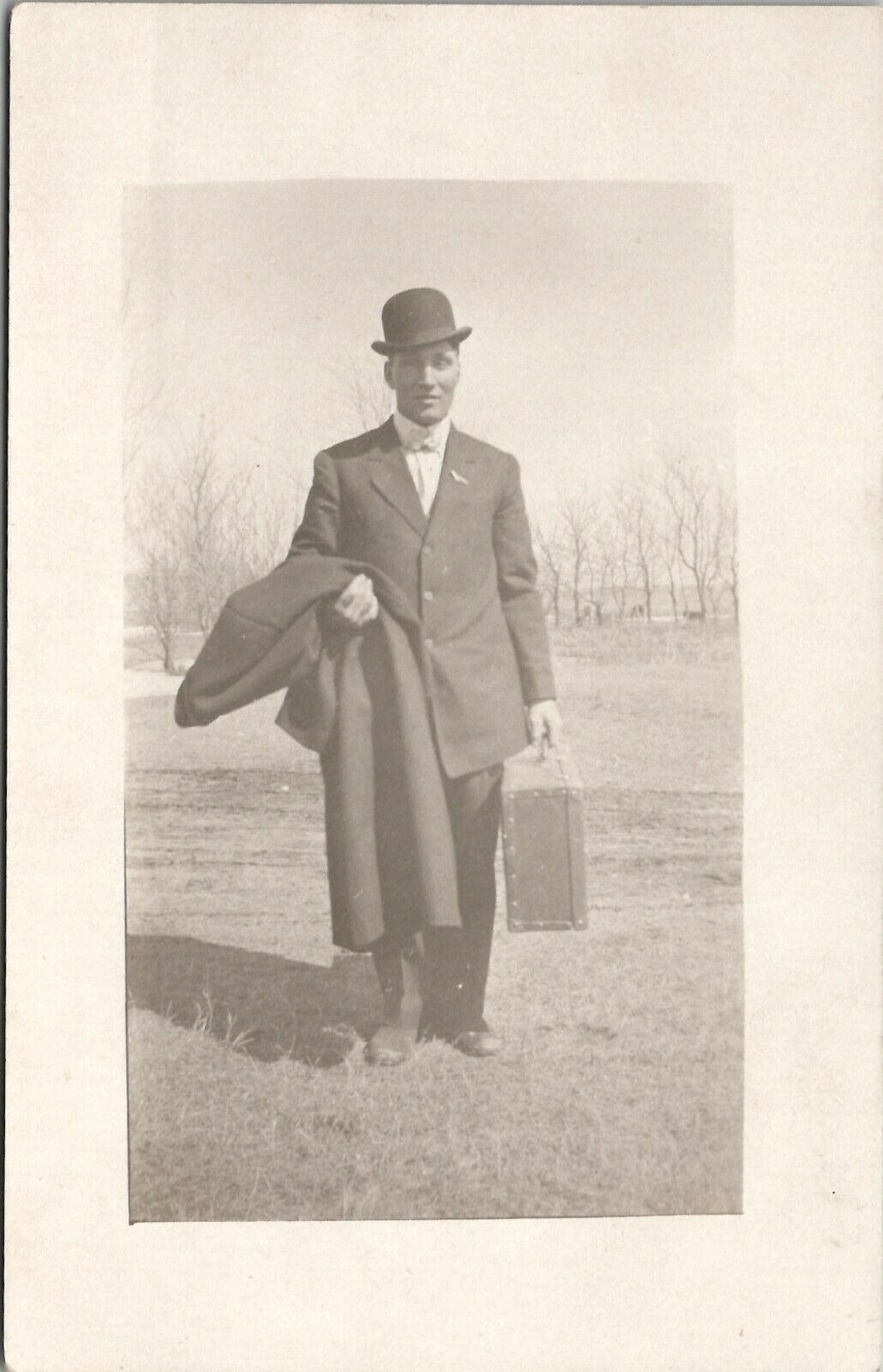 RPPC Dapper Attractive Man Gentleman Derby Hat Coat Suitcase Postcard V5