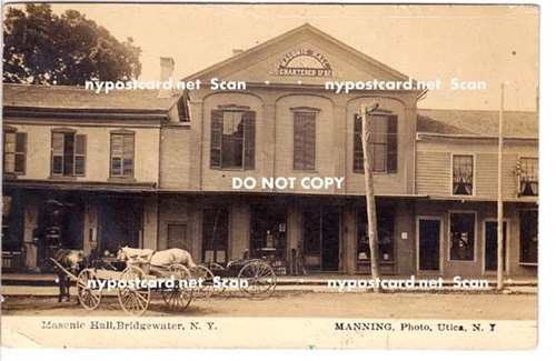 Rppc, Masonic Hall, Bridgewater Ny Description: Postal Usage: PM 1909 Condition: Very Good Type: RPPC Note: County: Oneida Co. > Bridgewater