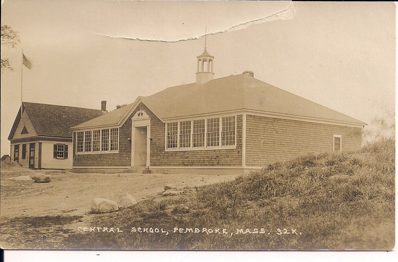 .Standard size real photo postcard from Pembroke, Massachusetts, showing the Central School. Medium condition, tear on upper center, please see both scans. Combined shipping discount applies to all multiple purchases.