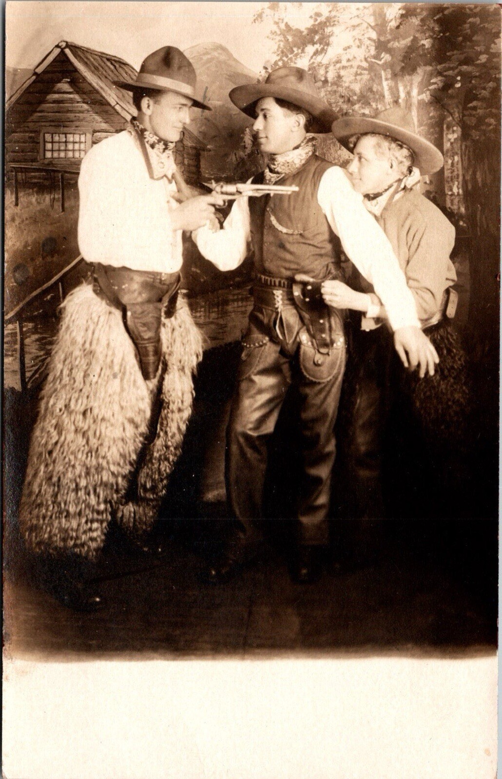 RPPC POSTCARD Cowboys Sheepskin Chaps Guns Studio c1910 JD19