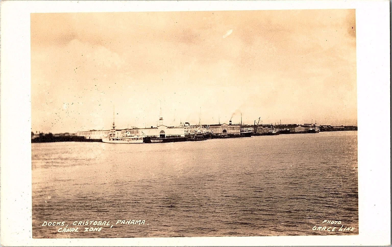 This vintage real photo postcard captures the docks at Cristobal in the Panama Canal Zone, showcasing a mid-20th century maritime scene. The image features a large ship docked along the waterfront, providing a glimpse into the bustling port activities during the 1950s. The sepia tone adds a nostalgic feel, highlighting the historical significance of the Panama Canal as a crucial global shipping route.Printed as a real photo postcard (RPPC), this original paper card measures the standard size of approximately 5.5 x 3.5 inches. The postcard is unposted and bears the typical correspondence and address sections on the back, with a faint "POST CARD" imprint visible. The detailed view of the ship and dock infrastructure makes it a desirable collectible for enthusiasts of maritime history, Panama Canal memorabilia, and vintage postcards from North America.