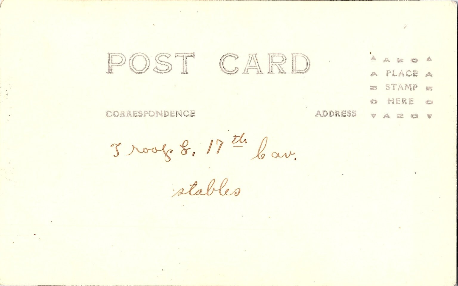 This vintage real photo postcard from the 1950s captures a unique rear view of a group of horses standing side by side in front of a stable building. The image evokes a rustic, equestrian atmosphere typical of mid-20th century rural or farm life. The postcard is a genuine original printed on photographic paper, showcasing fine detail in the horses' coats and the textured stable wall behind them. The back of the postcard features a classic divided layout with space for correspondence and an address, along with a printed prompt for postage placement. Handwritten in ink is a note that reads "3 roof & 17th lav. stables," which may indicate the location or reference to the stables depicted. Believed to be horses lined up at the 17th Cavalry stables, early 1900s. Handwritten note reads “I took it, 17th Cav. stables.” Excellent military and cavalry history image showing U.S. Army horse operations prior to mechanization. Original RPPC with light age wear.