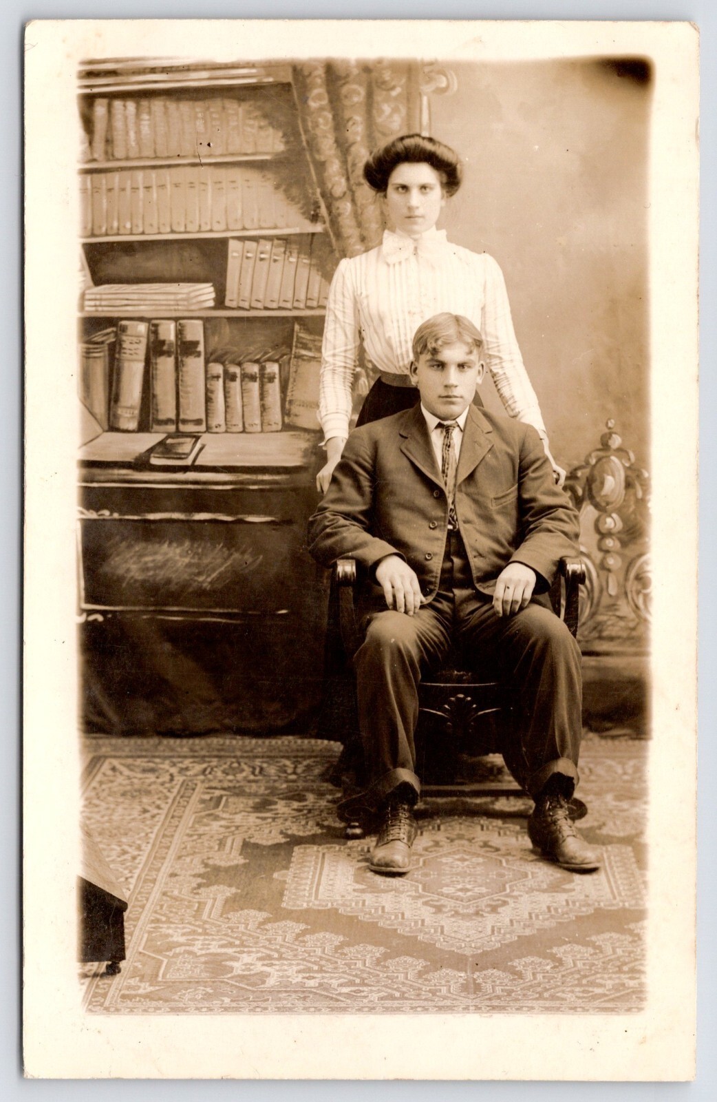 RPPC Studious Sister? & Bookish Brother?~Elaborate Library Studio Backdrop c1913