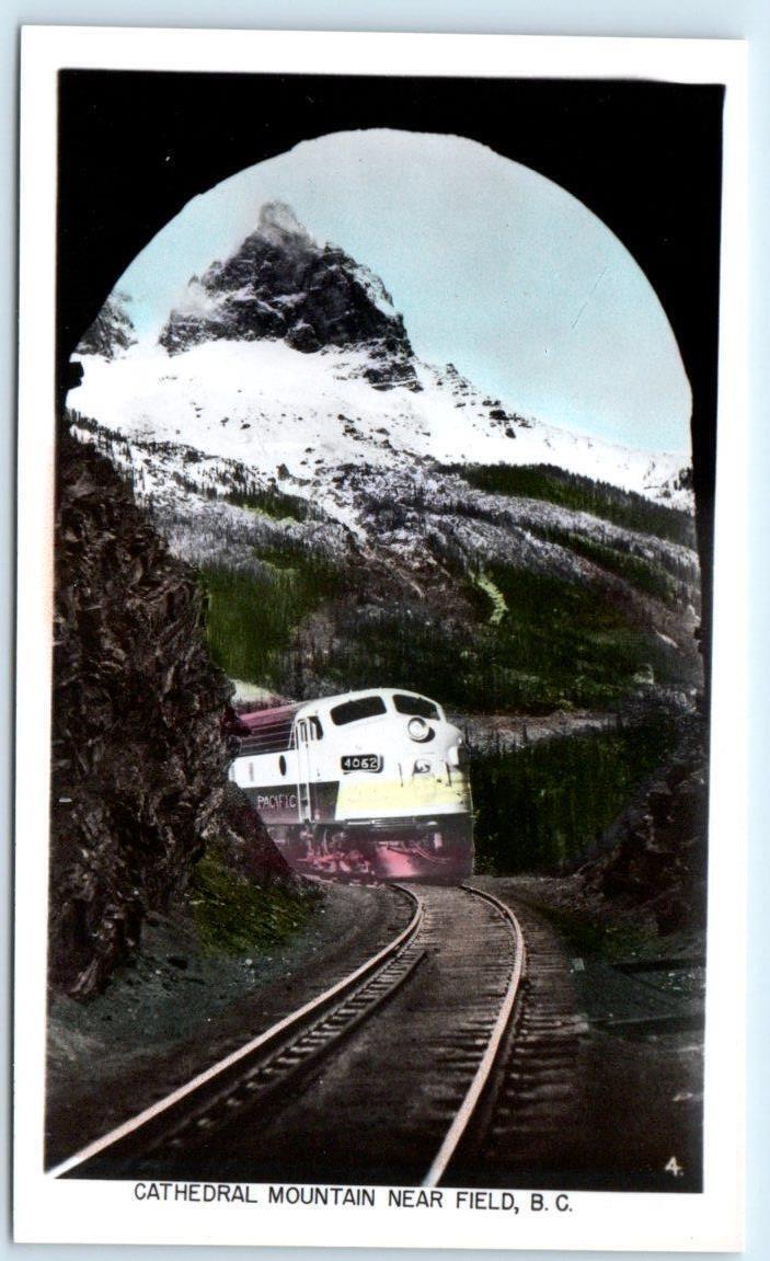 RPPC (Tinted) FIELD, BC Canada RAILROAD TRAIN at TUNNEL c1940s Postcard