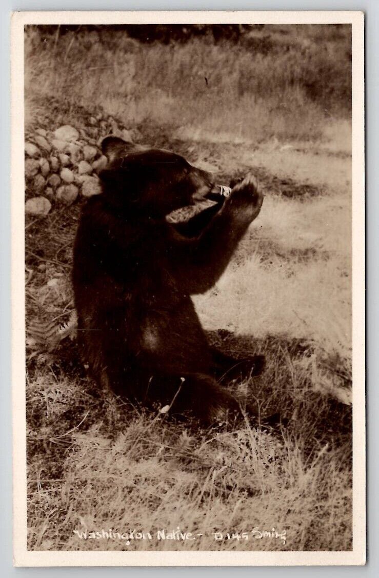 RPPC Washington Native Cute Brown Bear Drinking From Soda Bottle Postcard A46