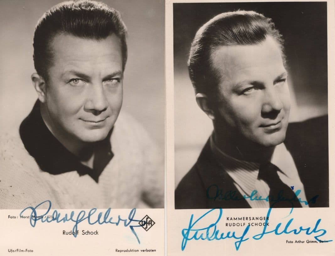 PFAS24 This is a superb opportunity to secure two hand signed photos of German opera singer Rudolf Schlock where both are hand signed by Rudolf Schock where his signature rests perfectly accompanying his portrait and these are in absolute mint condition and both are undedicated too - You wont find a better autograph opportunity than this listing.