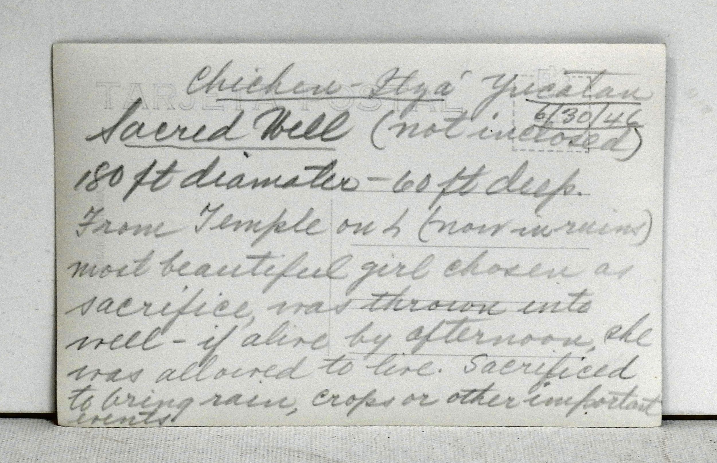 RPPC Postcard; Chichen-Itza; Sacred Well; Yucatan, Mexico; handwritten description on the address side including a date of 6/30/46; handwriting in pencil is darker in the photograph than on the card itself.