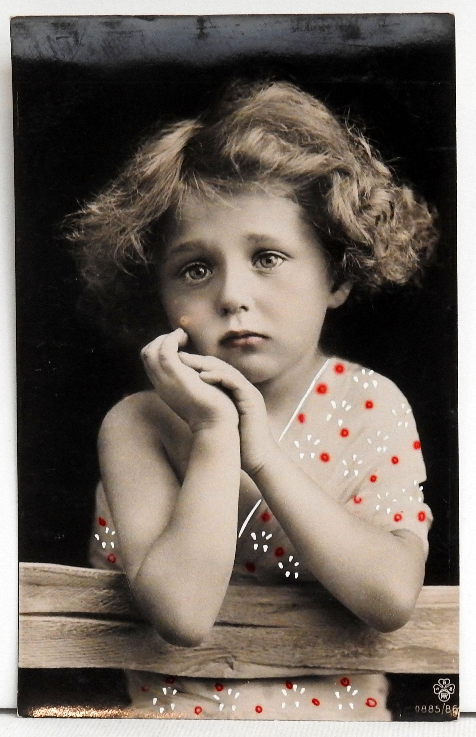 Sad little girl. Antique postcard from S. Bluh/Rotophot, Vienna/Berlin. Writing in French but has not been posted.