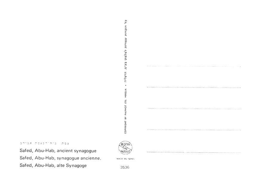 Safad Abuhab Synagogue - Israel Grade: 1 Category: Continental Size Postcard, Approx 4 in x 6 in (10 cm x 15.25 cm) Product Size: Continental size: 4X6 inches (10.5 cm x 15 cm) Grading Scale: Grade 1 = Perfect ... Read More