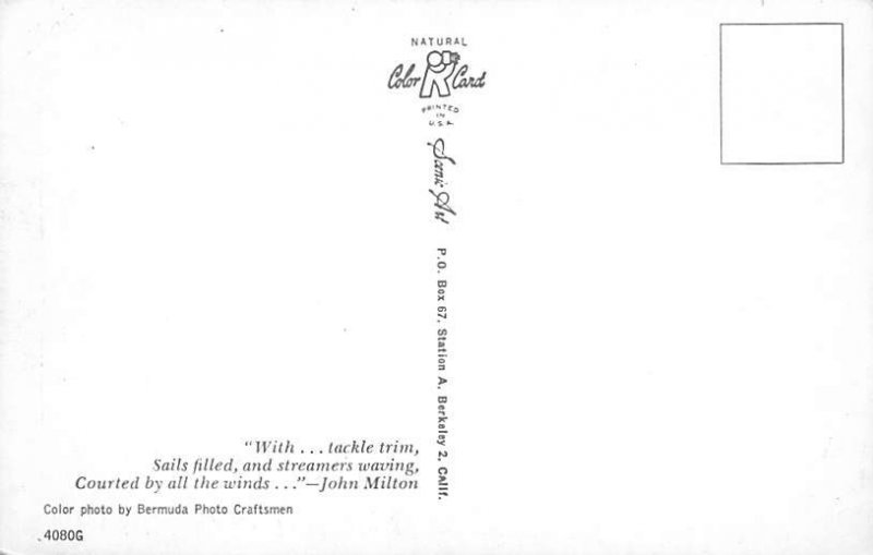 Sails Filled and Streamers Waving Bermuda Postcard Postal Date: {{Product Field 4 ( Postal Used, Unused)}} Grade: 2 Size: Regular Size Postcard - approximately 3 1/2 inch x 5 1/2 inch (9 CM x 14 CM) Grading Sc ... Read More