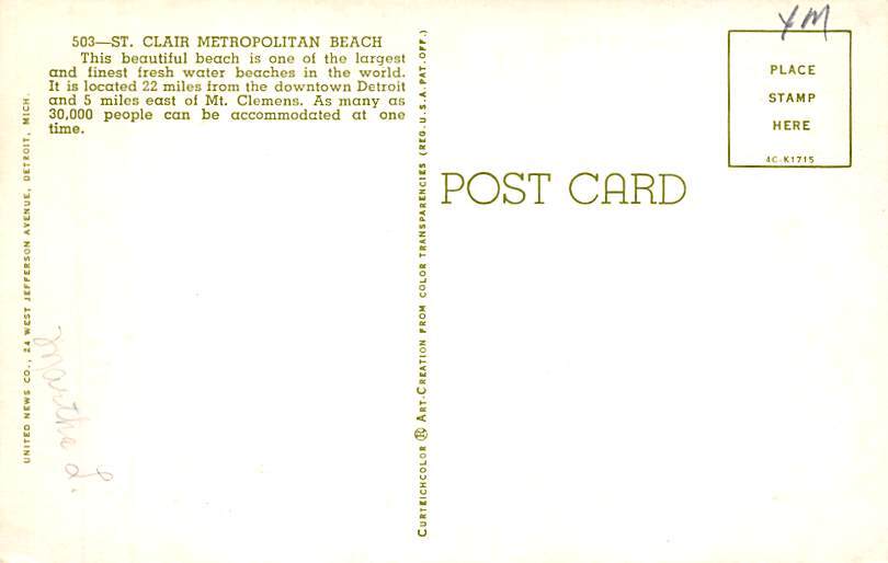 Saint Clair Metropolitan Beach Beautiful Beach - Lake St. Clair Metropark, Michigan MI Postcard - View back side image Grade: 1 Size: R - Regular Size Postcard - approximately 3 1/2 inch x 5 1/2 inch (9 CM x 14 C ... Read More