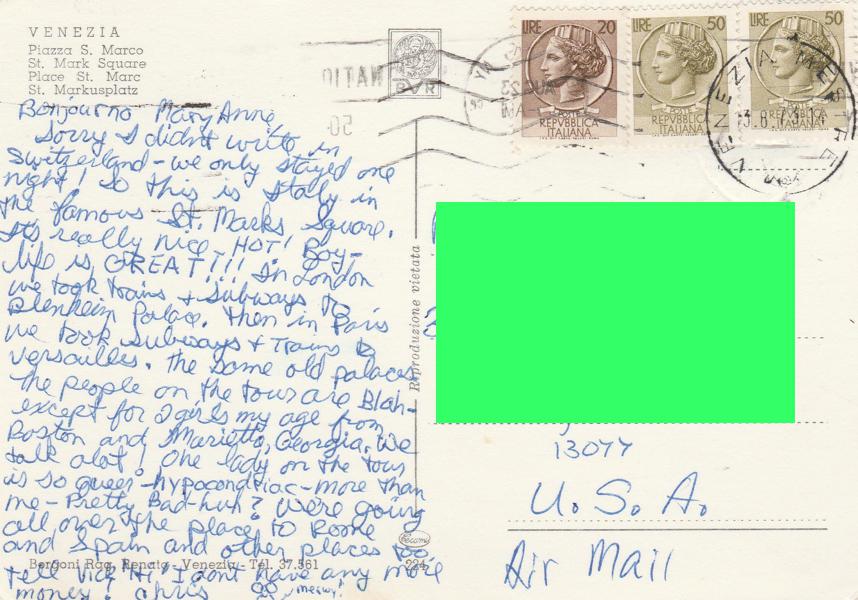 Saint Mark Square - Venezia - Venice, Italy. Continental sized chrome card. Postmarked at Venezia on August 13, 1973. Good to very good condition. (Names and/or address digitally blocked).