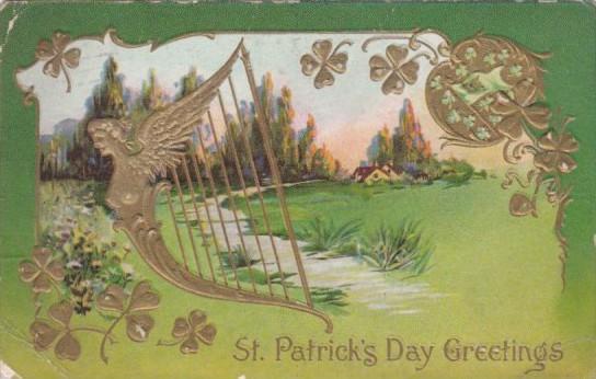 Saint Patrick's Day Gold Harp & Landscape Scene 1910