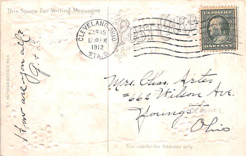 Saint Patricks Day Postcard Saint Patricks Day Postcard, Grade: 3 Size: Regular Size Postcard - approximately 3 1/2 inch x 5 1/2 inch (9 CM x 14 CM) Grading Scale: Grade 1 = Perfect corners Grade 2 = Very Minim ... Read More