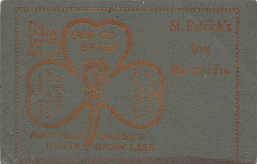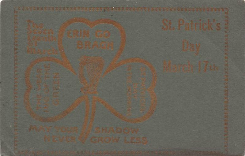 Saint Patricks Day Postcard Saint Patricks Day, Grade: 4 Size: Regular Size Postcard - approximately 3 1/2 inch x 5 1/2 inch (9 CM x 14 CM) Grading Scale: Grade 1 = Perfect corners Grade 2 = Very Minimal corner ... Read More
