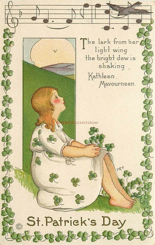Early Printed Postcard Saint Patrick's Day, Women Singing, 3 Leaf Clover, Embossed Postmark: None Image: Nice and clean Corners: Light wear Faults/Other: