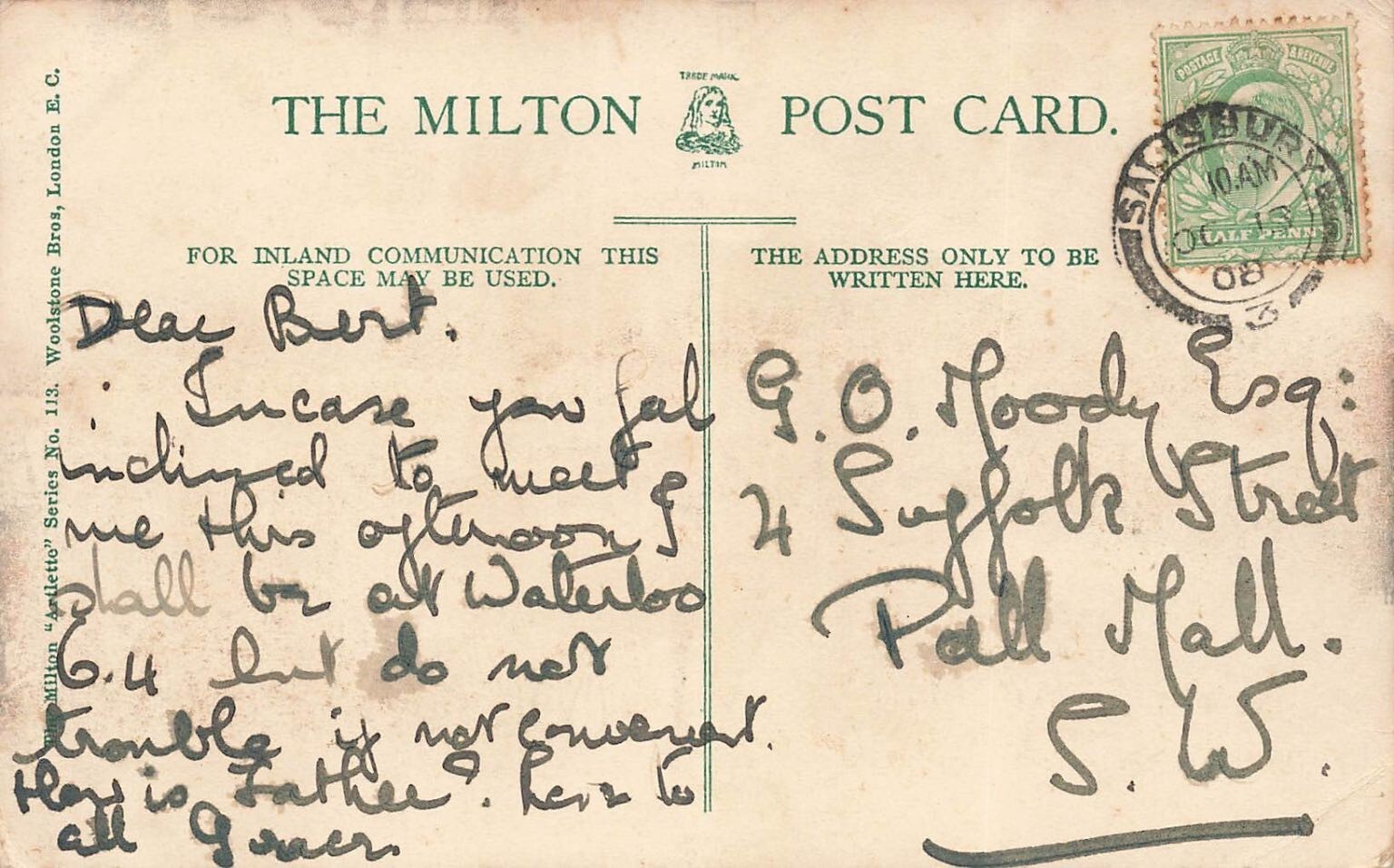 Discover a charming piece of early 20th-century history with this antique postcard featuring the iconic Salisbury Cathedral. The picturesque scene captures the magnificent cathedral spire reflected in a tranquil meadow waterway, offering a serene and classic view of this historic English landmark. The vibrant, hand-colored appearance characteristic of early photochrom or similar printing techniques brings the landscape to life, showcasing the architectural grandeur of the cathedral against a backdrop of lush greenery.This collectible postcard is a product of The Milton Post Card series by Woolstone Bros., London E. C., known for their quality early 20th-century issues. The reverse side bears a clear Salisbury postmark dated 1908, along with a King Edward VII halfpenny stamp, marking it as a genuine piece of Edwardian-era correspondence. The detailed address to Suffolk Street, Pall Mall, London, adds a fascinating glimpse into the past, making this a unique item for collectors of British topography, cathedral views, or social history memorabilia.