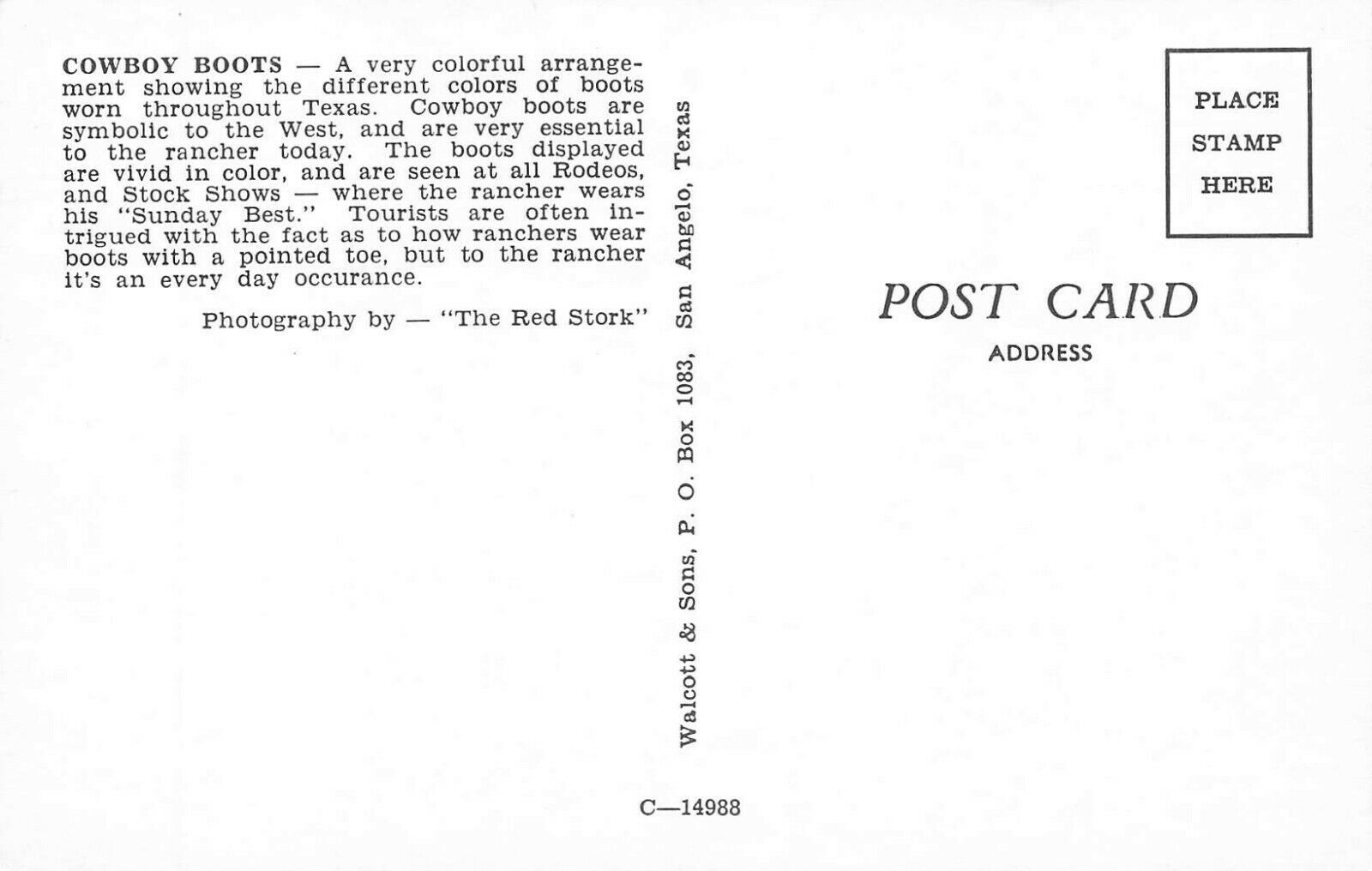 Condition: Used San Angelo Tx Cowboy Boots, Postcard. This Postcard, Is an Original and Not a Copy. If you buy more than one item 'buy it now' Please use the 'add to basket' function as this will activate the comb ... Read More