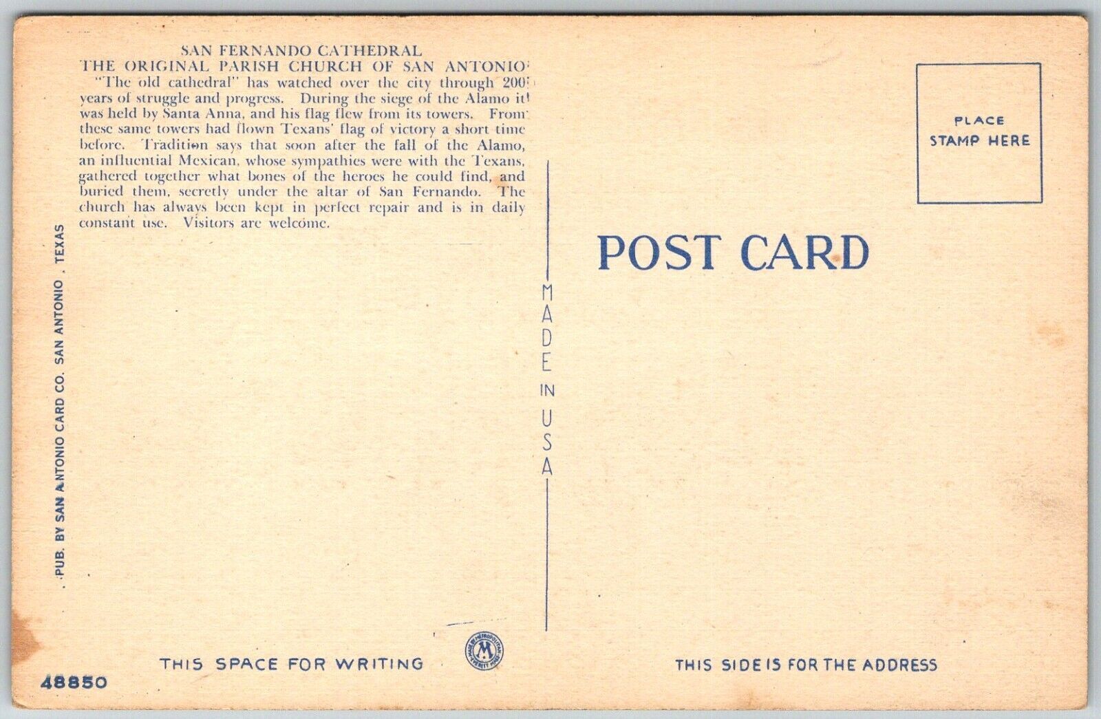 San Antonio Texas 1940s San Fernando Cathedral Postcard