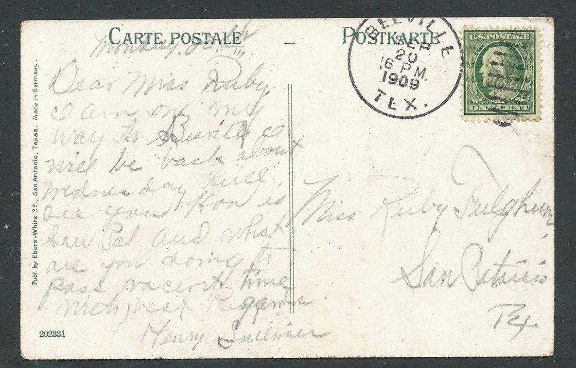 Postmarked: Bellville, Tx Sept 20, 1909 Note: No street address in San Antonio with a population of about 96,000 and delivered.