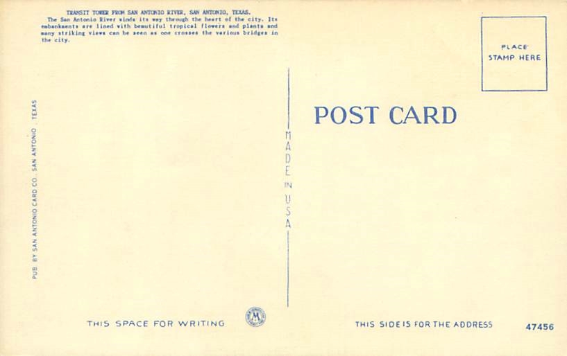San Antonio Texas Transit Tower, Flag, Bridge Linen Postcard Publisher: San Antonio Card Co Condition: No major flaws.